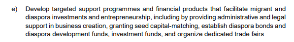 Utvikle målrettede støtteprogrammer og finansprodukter som legger til rette for investering og entreprenørskap for migranter og diasporaer, herunder ved å gi administrativ og juridisk støtte til bedriftsetablering, ved å matche startkapital, etablere diasporaobligasjoner og utviklingsfond, investeringsfond for diasporaer, samt organisere egne varemesser.