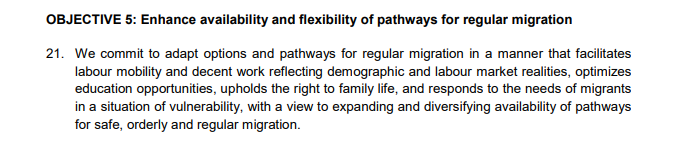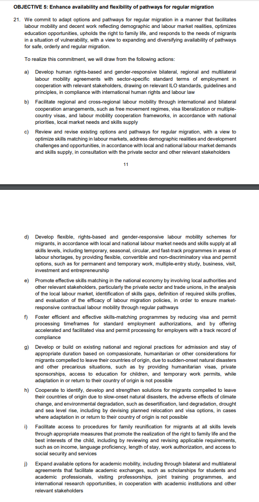 Dette skal gjøres på en måte som «tar sikte på å skaffe flere og mer mangfoldige veier til trygg, velordnet og regulær migrasjon».