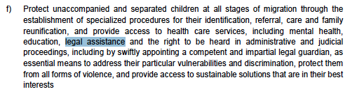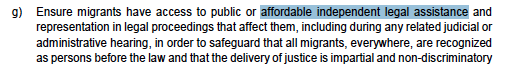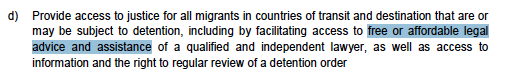 Under mål 13, som omhandler fengsling og internering av migranter, står det at det skal gis tilgang til gratis eller rimelig rettshjelp fra en kvalifisert og uavhengig advokat hvis de står i fare for å bli fengslet.