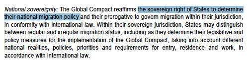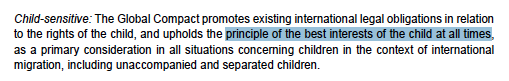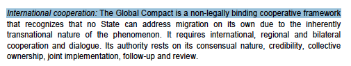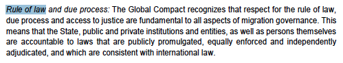 - Alle parter, stater, organisasjoner, selskaper og migranter har et rettsvern og må respektere gjeldende rett, inkludert menneskerettighetene.