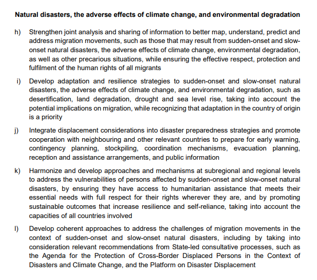 samarbeide om å identifisere, utvikle og styrke løsninger for migranter som tvinges til å forlate sine opprinnelsesland på grunn av langsomme naturkatastrofer, skadevirkningene av klimaendringer, miljøforringelse, herunder forørkning, jordforringelse, tørke og havstigning, herunder ved å utvikle alternativer med relokalisering og visum, i tilfeller der tilpasning i eller retur til opprinnelseslandet ikke er mulig.