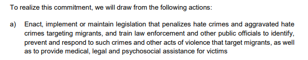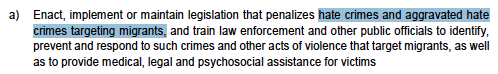 Under punktet om bekjempelse av hatkriminalitet står det et de migrantene som blir offer for slik kriminalitet skal gis medisinsk, juridisk og psykologisk hjelp.