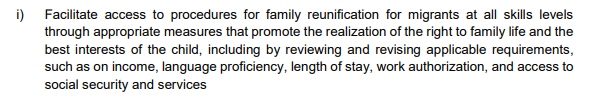 I detfemte målet i FN-plattformen står det at landene skal gi migranter, uavhengig av ferdighetsnivå, mulighet til å søke om familiegjenforening. Dette skal gjøres slik at retten til familieliv og hensynet til barns interesser blir ivaretatt. Det innebærer å gjennomgå og revidere kravene for å kunne søke, som for eksempel krav til inntekt, språkferdigheter, lengden på oppholdet, arbeidstillatelse og tilgang til velferdsordninger.