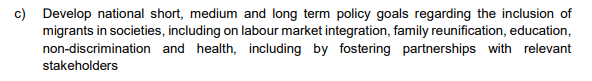 Plattformens 17. mål handler om å fjerne alle former for diskriminering av migranter, og å støtte opp under en kunnskapsbasert offentlig debatt om tematikken. Særlig ett tiltaker relevant for påstanden. Der står det at landene skal: