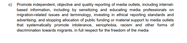 fremme uavhengig, saklig og god journalistikk i mediene, også internettbasert informasjon, herunder ved å bevisstgjøre og lære opp medieansatte i migrasjonsrelaterte spørsmål og begreper, investere i standarder for etisk journalistikk og reklame, og stoppe overføring av offentlig finansiering eller materiell støtte til mediekanaler som systematisk fremmer intoleranse, fremmedfrykt, rasisme og andre former for diskriminering av migranter, med full respekt for pressefriheten