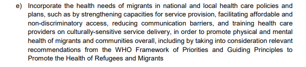 Det er tiltak «e» i plattformen som er mest relevant for denne påstanden. Der står det at man skal «innarbeide migranters helsebehov i politikk og planverk for helseomsorg på nasjonalt og lokalt plan».