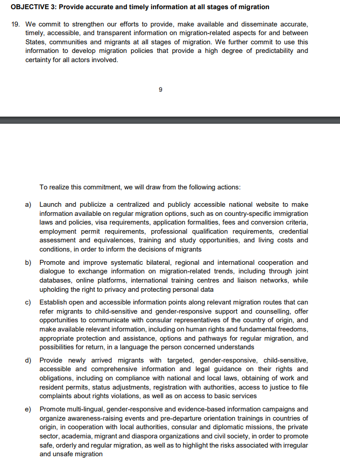 Informasjon til migranter omfattes av mål tre i FN-plattformen: «Skaffe til veie nøyaktig og rettidig informasjon på alle migrasjonsstadier».