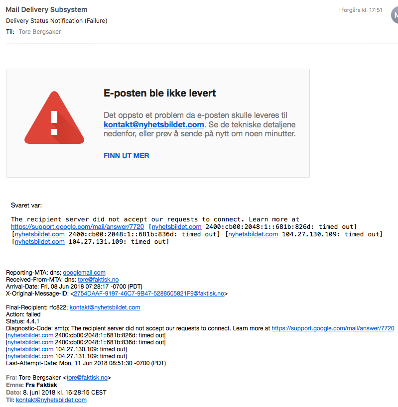 På Nyhetsbildet.com er det verken oppgitt hvem som driver siden eller «om oss»-info. Det er oppgitt en e-postadresse for kontakt, men når Faktisk.no sender e-post dit, kommer den i retur med beskjed om at den ikke kan leveres.